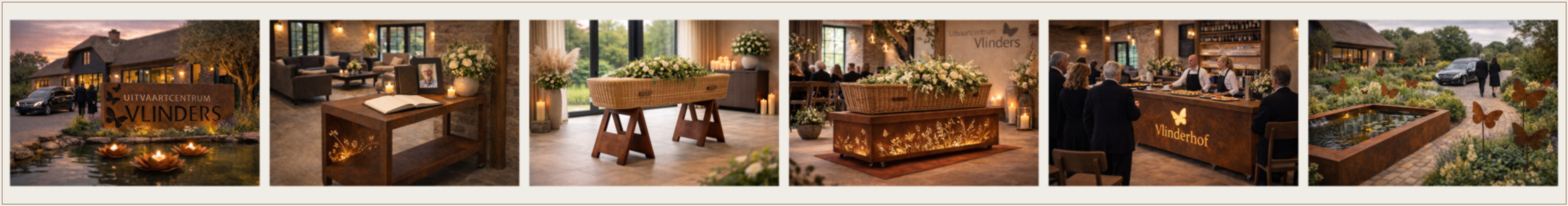 Hieronder ziet u een impressie van een – met zorg samengestelde – afscheidlocatie, waarin deze materialen en sferen op harmonieuze wijze samenkomen.